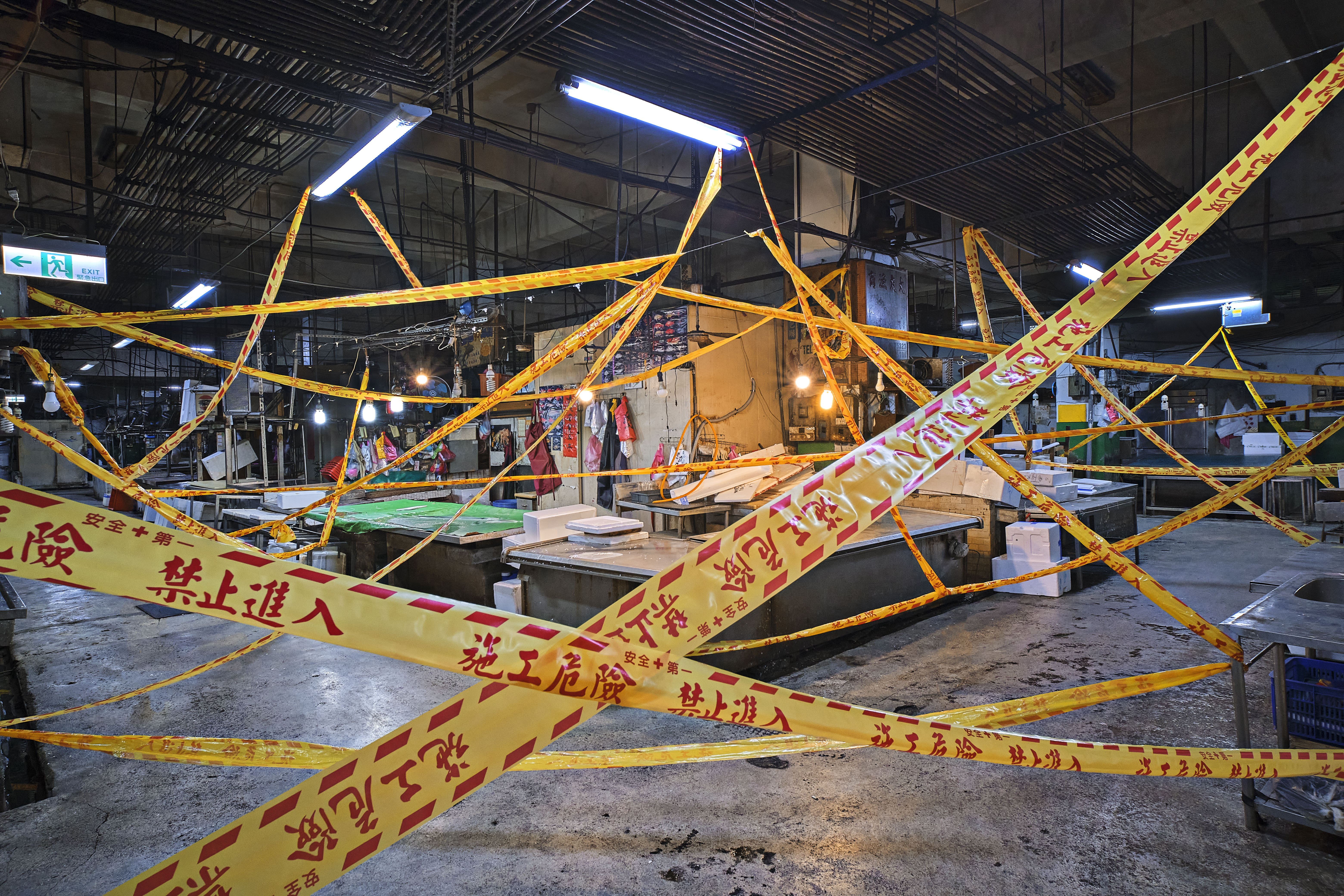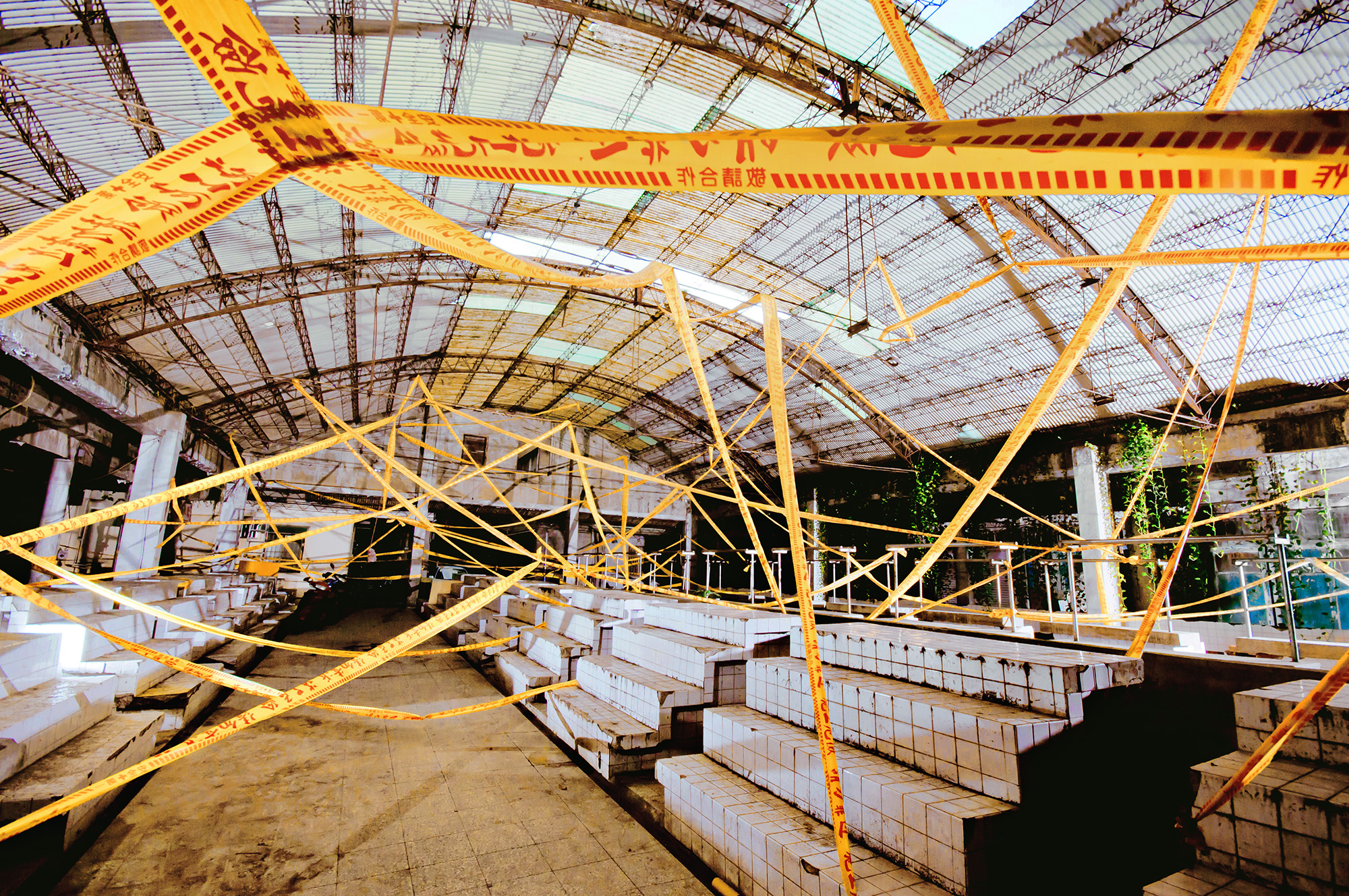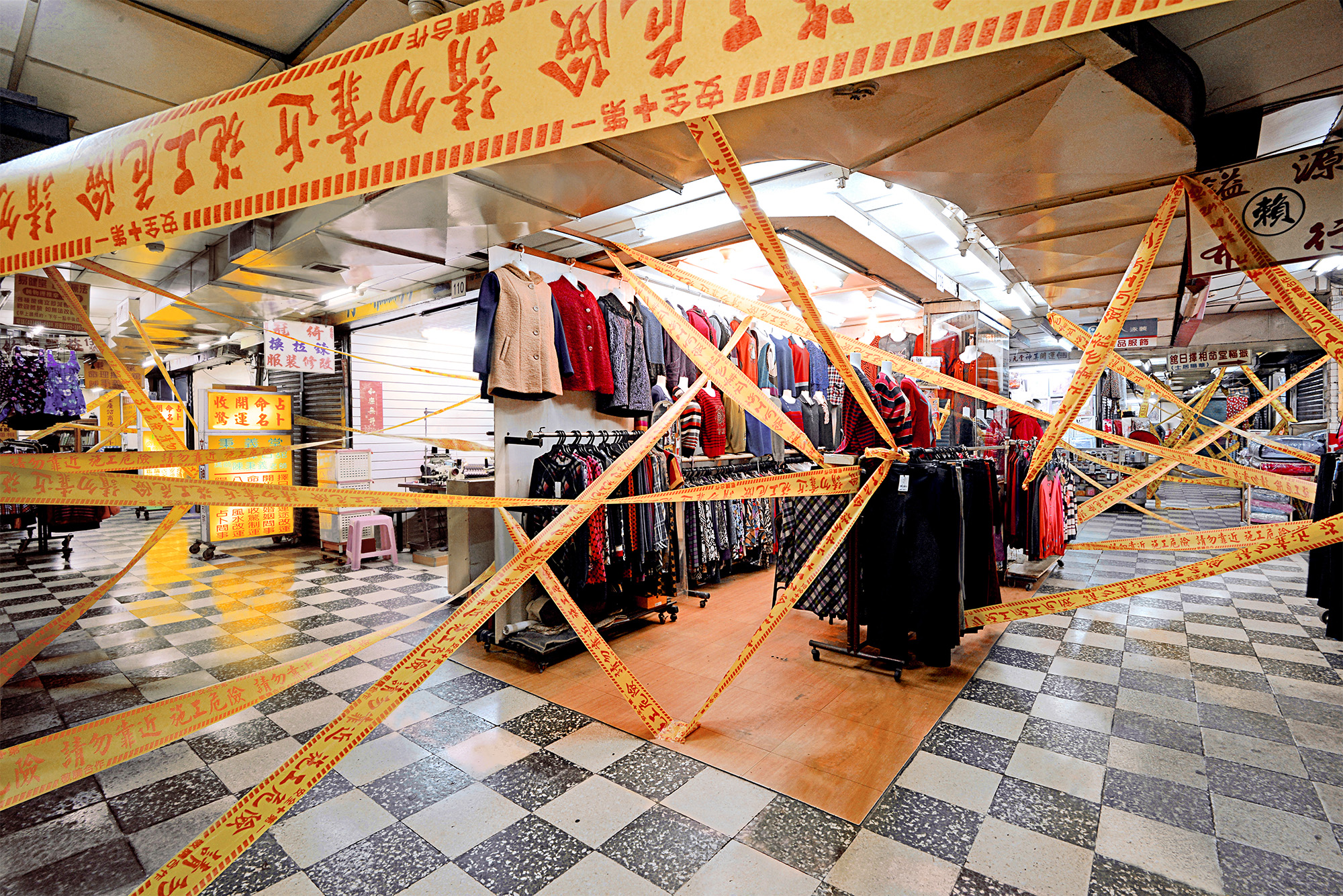 創作素材中,使用國家律法之具體物件之一:警戒線。其具有高張力的排外功能,裡面隱藏著法律及權力的佔據技術。作品中的警戒線纏繞於市場的內部空間,將原本邊界式的線性封鎖,變為一種交錯式的網狀纏繞佔據;由交織的複雜性取代單一的劃分,試圖干擾權力那略過重重曖昧線索的果斷裁決,將警戒線轉化為某種具有擴張或放大此場域之空間張力,形成當代中居所與國家間所產生的矛盾現實。