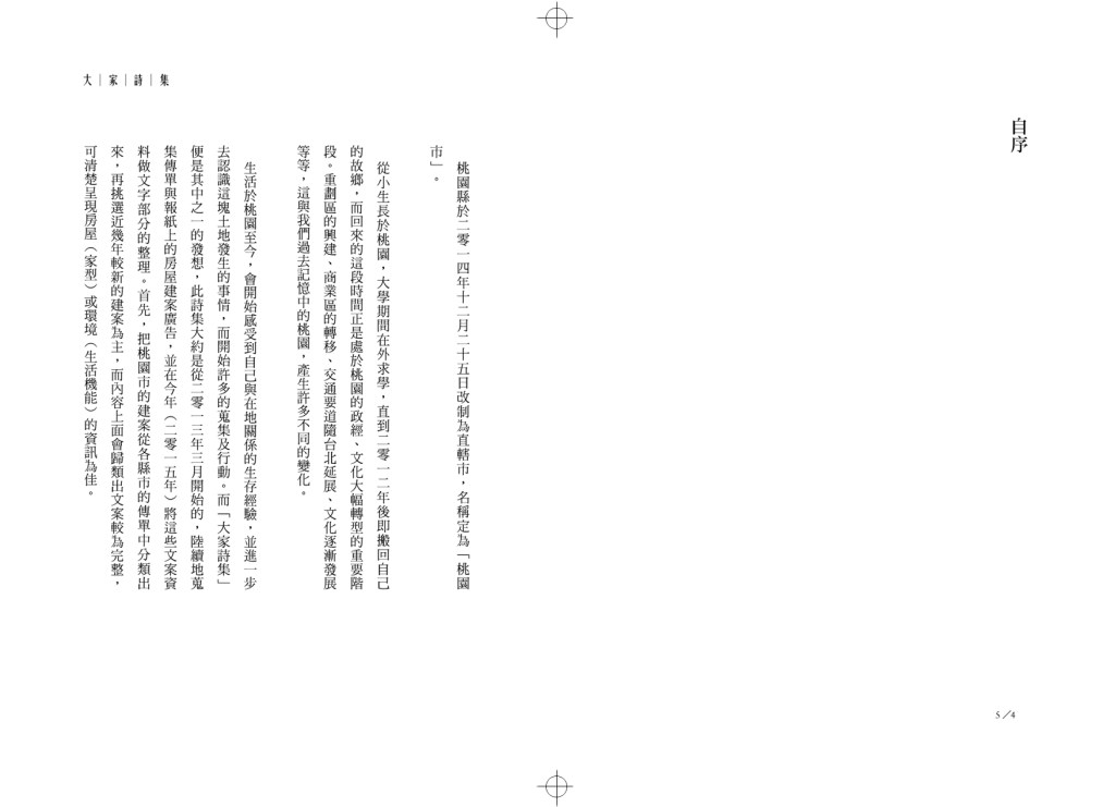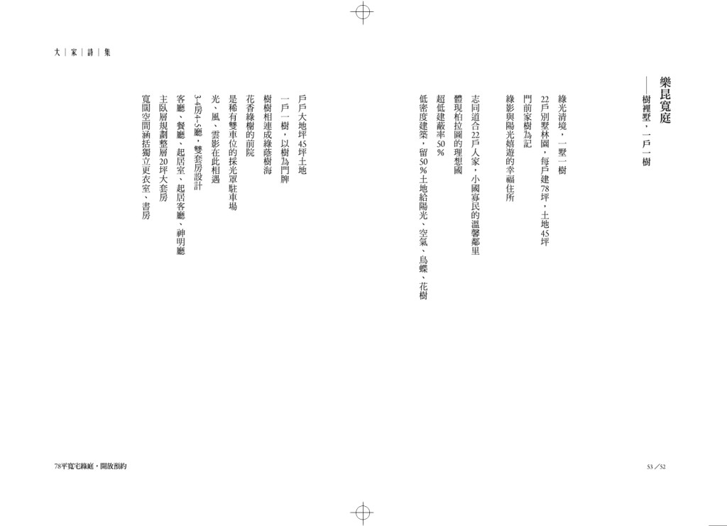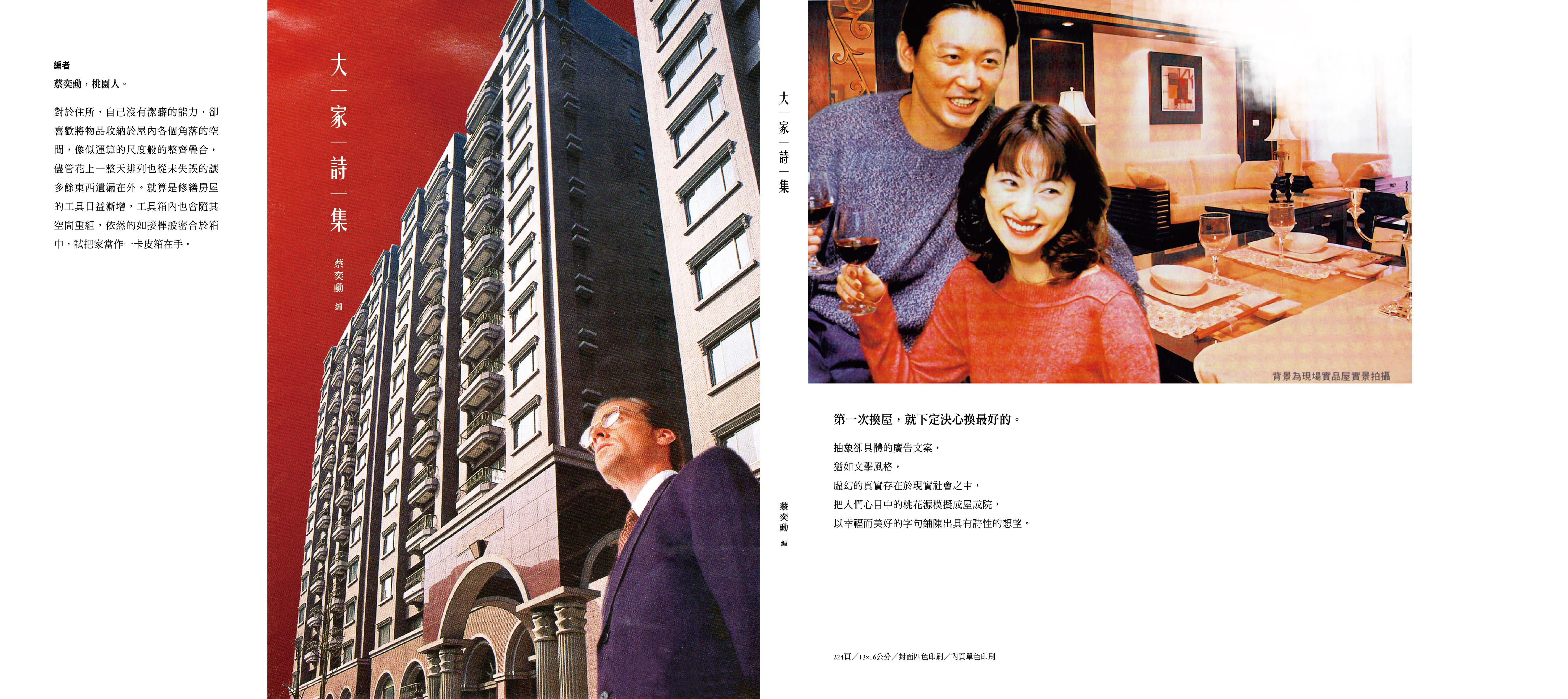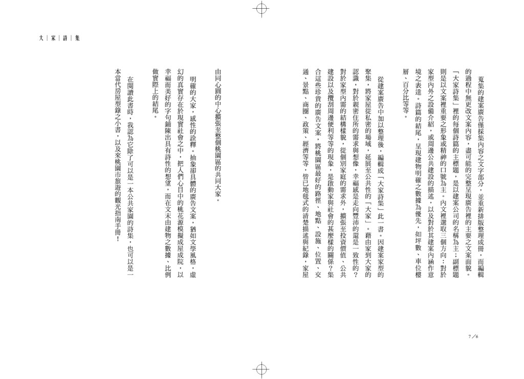 詩集內容是蒐集2013年、2014年桃園的建案廣告,採集其文案部分並重新排版成冊。內文呈現:家型內外之設備介紹,或周邊公共建設的描述,以及對於其建案內涵作意境之表達。而詩篇的結尾,呈現建物明確之數據,如坪數、車位樓層等。透過家型的聚集,將家屋從私密的場域,延展至公共性的「大家」。將家屋形容得美輪美奐,呈現出詩意的桃花源式家園。