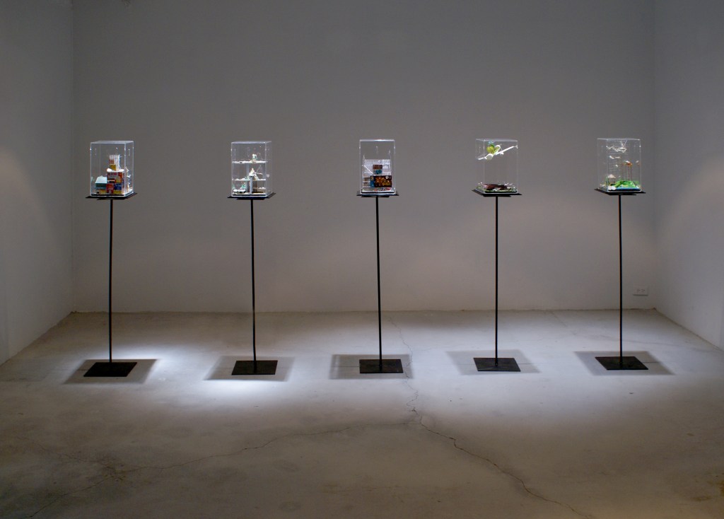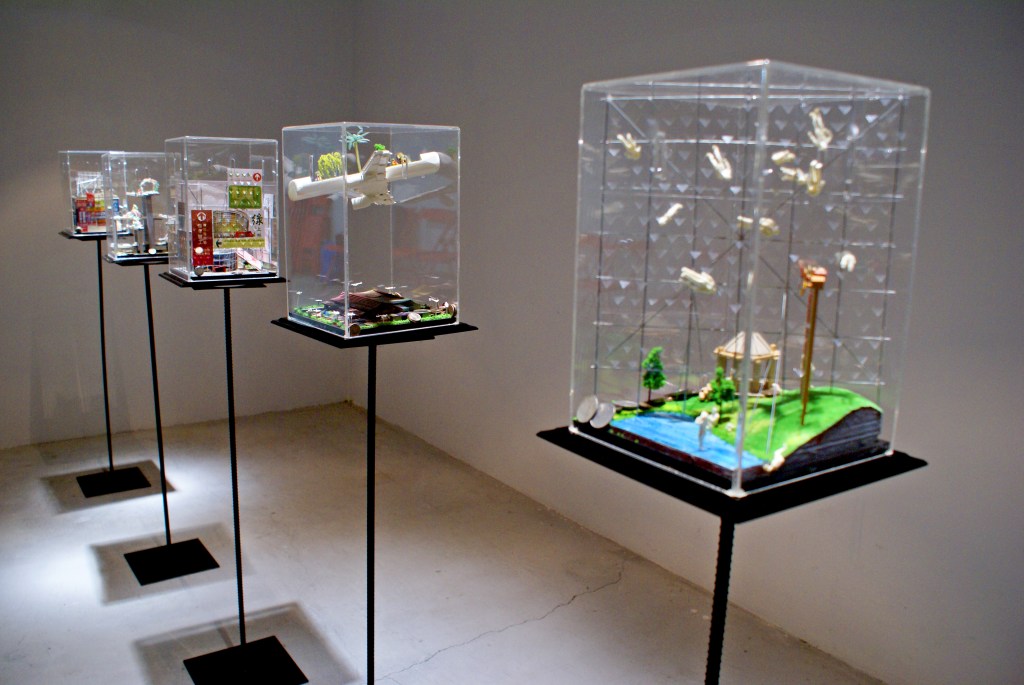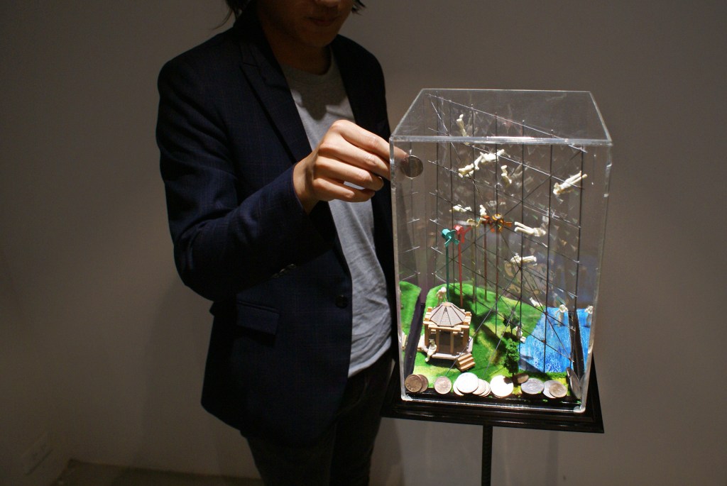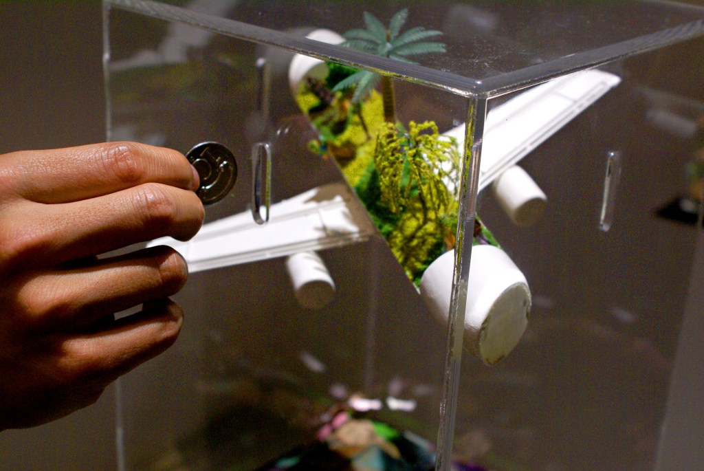 There are four holes on the clear display showcase which covering the model for viewers to insert coins until it’s flooded completely.