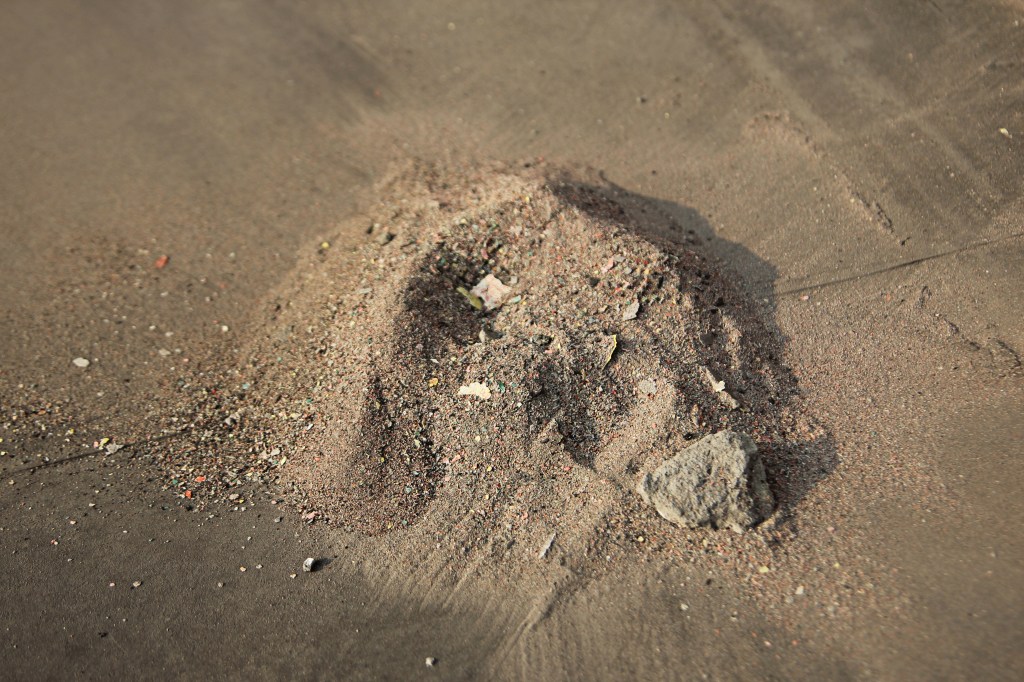 完成後,踏回地面,原本斑剝褪色的漆面化為粉末靜靜的落下,地面厚厚一層的斑斕色點,以不同形式更去貼近變遷中時間的意涵。